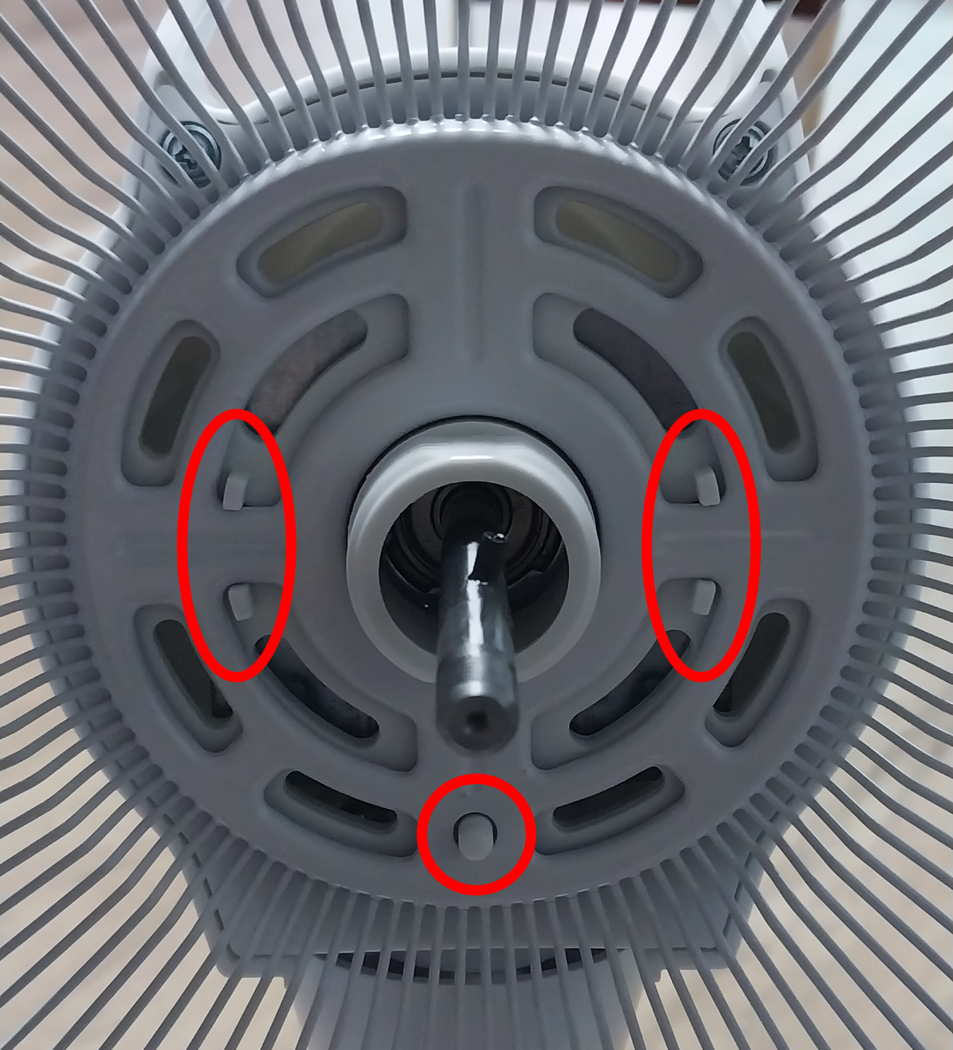 그다음 삐죽한 톱니로 끼워서 후면을 고정하고, 검은 기둥에 맞춰 날개도 끼워줍니다. 가운데 기둥에는 윤활유가 있어서 만지지 않는 것이 좋습니다. 참고로 날개에는 손가락 넣지 말라는 경고 스티커가 붙어있는데, 보기 좋진 않아서 떼어냈습니다. 스티커를 대충 제거하고 에프킬라 같은 살충제 스프레이를 뿌리면 스티커 제거가 수월합니다.