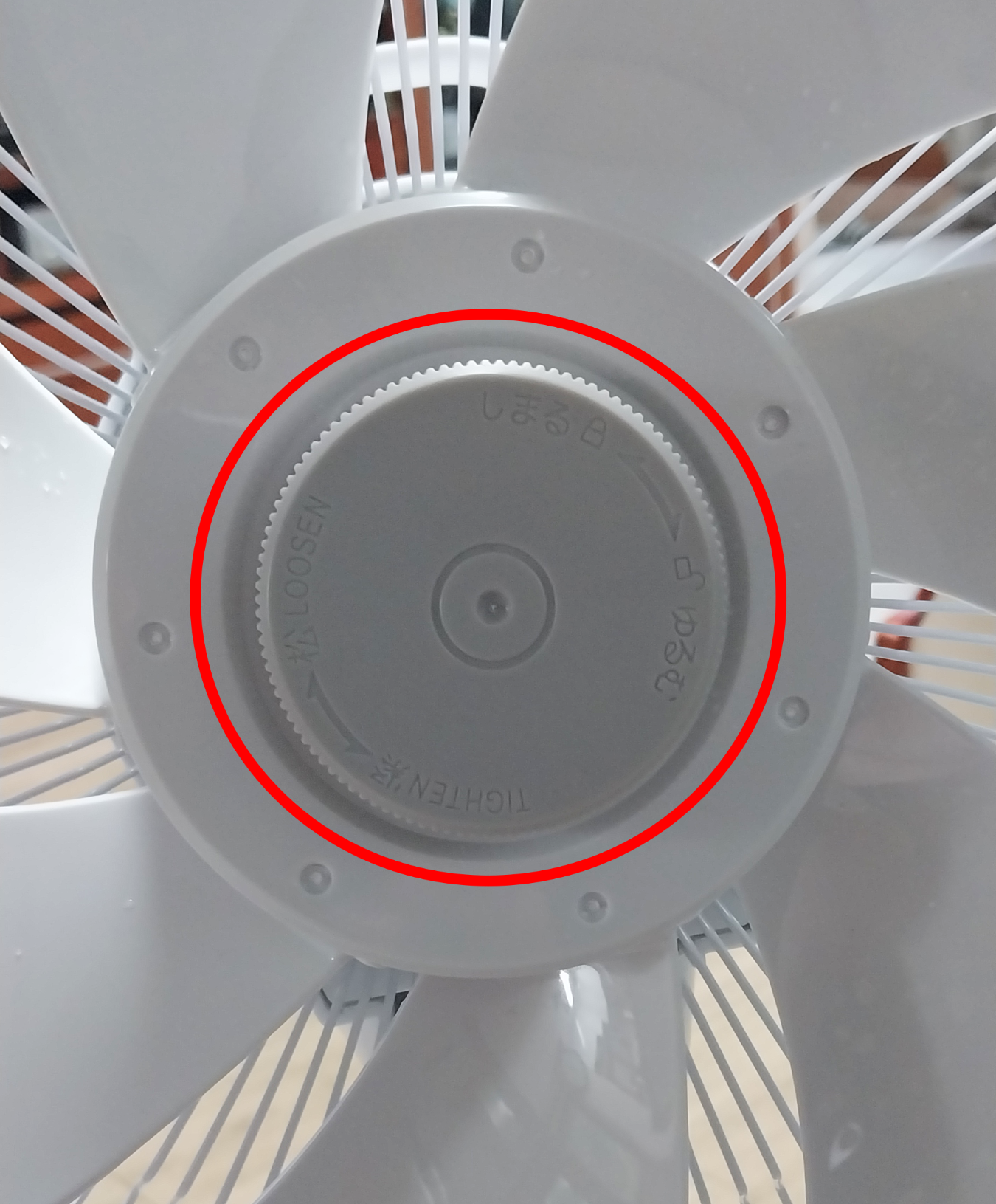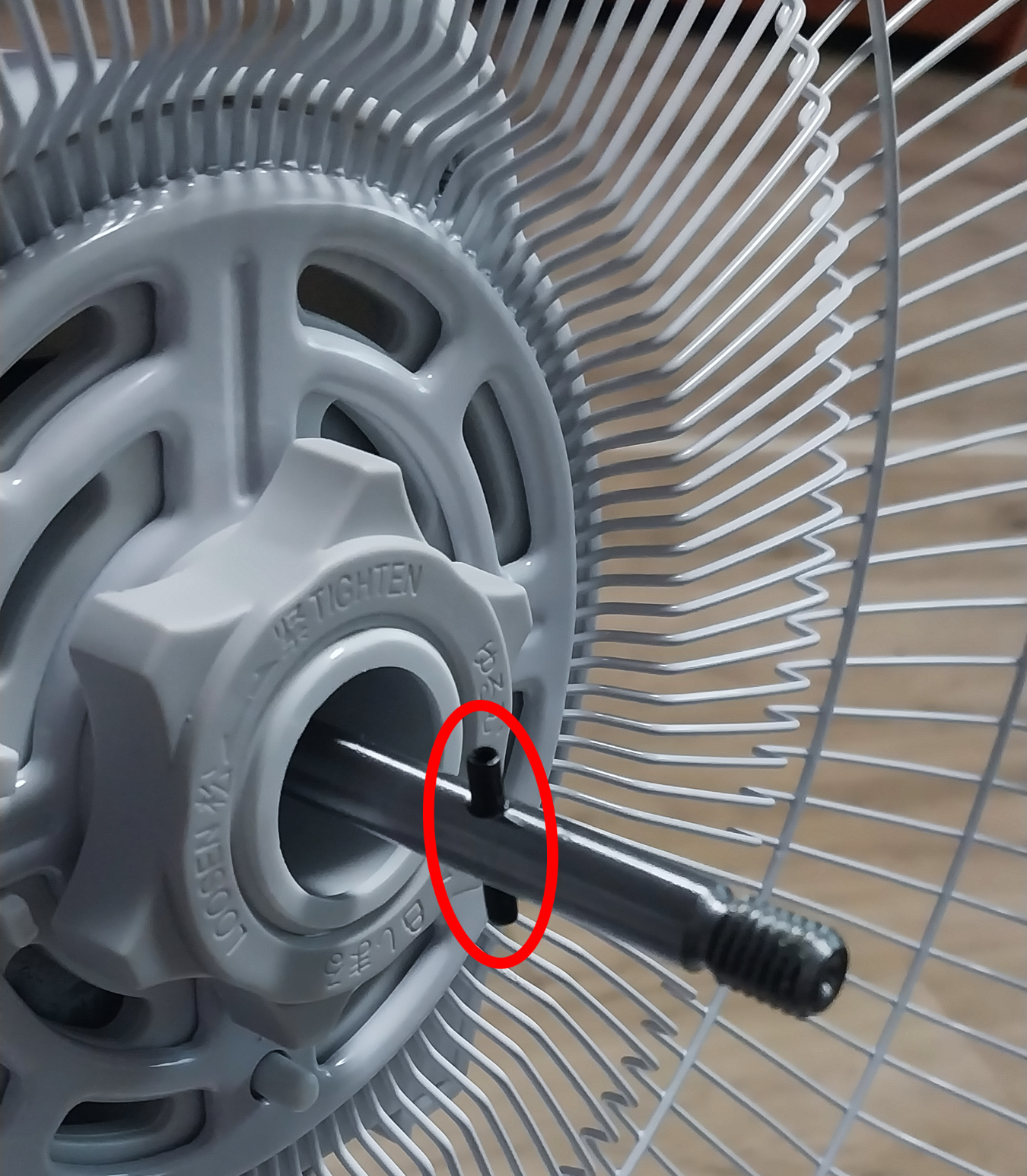 선풍기 날개를 고정할 둥근 뚜껑을 마저 잠급니다. Tighten이라고 쓰여있는 방향으로 돌리면 됩니다.